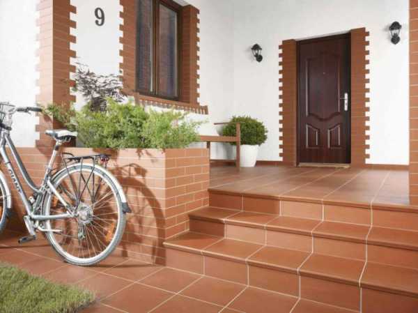 Керамическая или керамогранитная плитка подойдет для облицовки ступеней, площадки и участков стен вокруг двери. Материал прост в использовании, долго служит и органично вписывается в классический стиль. Участок станет единым, завершенным и эстетичным. Но во избежание скольжения выбирайте матовую или рельефную плитку, а не гладкую.