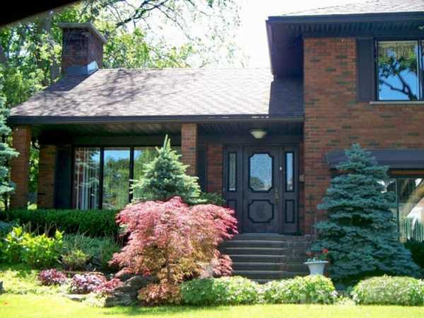 - Очень популярен способ в украшении крыльца и фасада дома — это его богатое озеленение. Обычно по краям дома стараются высаживать высокие деревья, а затем кустарники пониже. Таким образом, устраивается определённое направление, которое указывает подход к дому.