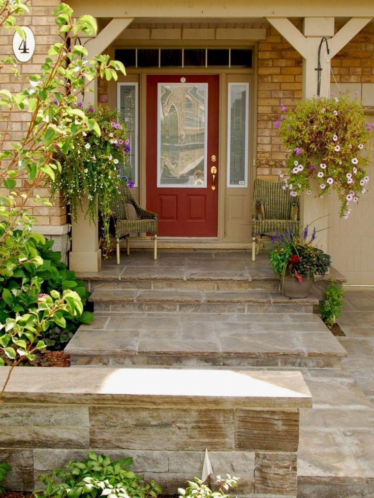 Эта часть строения жилого дома и её оформление должно быть так же красиво, как и дверь. Здесь могут присутствовать различные цветы в разнообразных вазонах, декоративные фонари, статуэтки и любые другие атрибуты для уютной усадьбы.