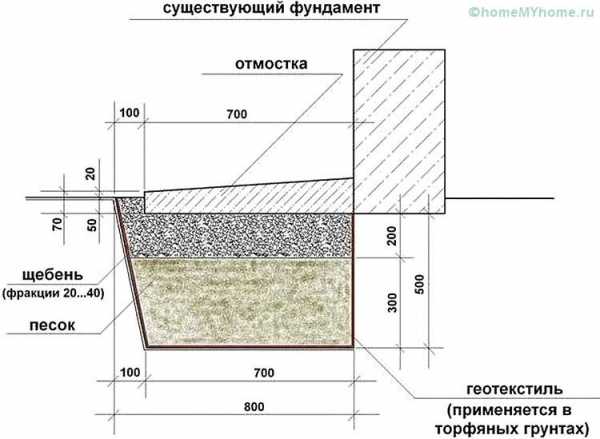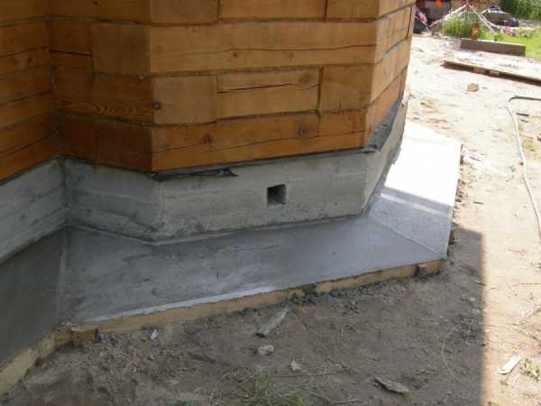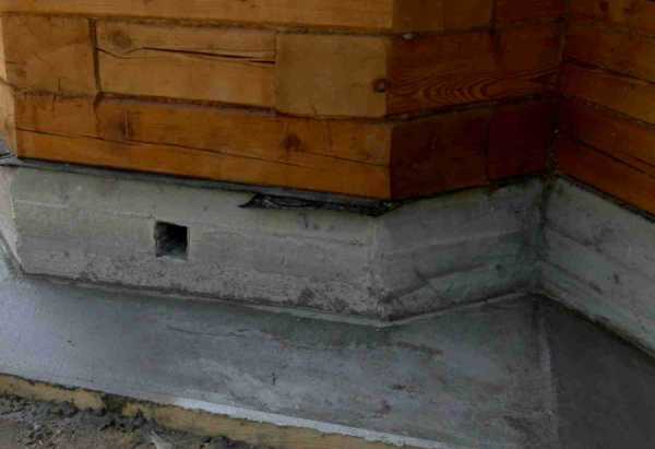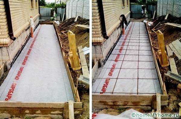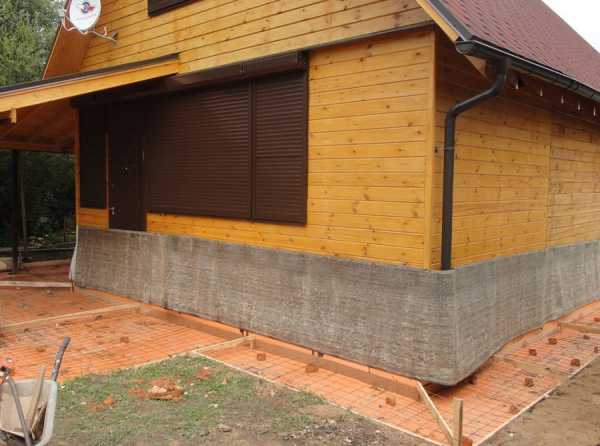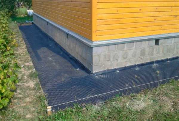 На основание укладывается гидроизоляционный слой (рубероид, геотекстиль и т.д), внахлест на фундамент. Желательно, предварительно произвести обмазочную гидроизоляцию фундамента. Для этих целей подойдут битумные мастики и праймеры.