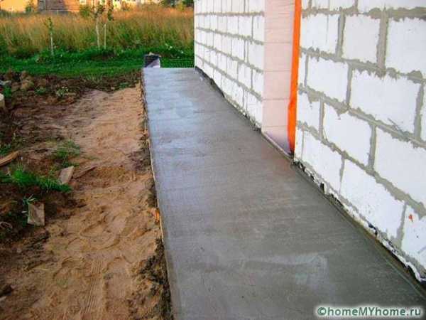 Если вы собрались залить площадку вокруг дома бетоном, то можно его купить на ближайшем заводе. Это значительно снизит ваши трудозатраты на изготовление защитной конструкции. Доставка бетона осуществляется специальными машинами, которые имеют желоба для распределения состава. Вам останется лишь разровнять бетон и равномерно уложить его на подготовленной территории.