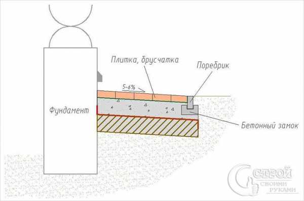 Поэтому в основном применяют для отмостки бетонные, асфальтные, каменные или плиточные покрытия.