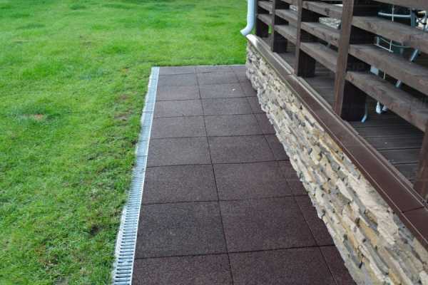 Противоположный пример — резиновая или полимерпесчаная плитка, стоимость который может быть в 3-4 раза выше бетонных аналогов. Натуральный камень — отличный вариант для отмостки. Но есть два минуса: сложность укладки натурального камня (не идеальная форма) и его высокая стоимость (касается гранита, песчаника и прочных сланцев).