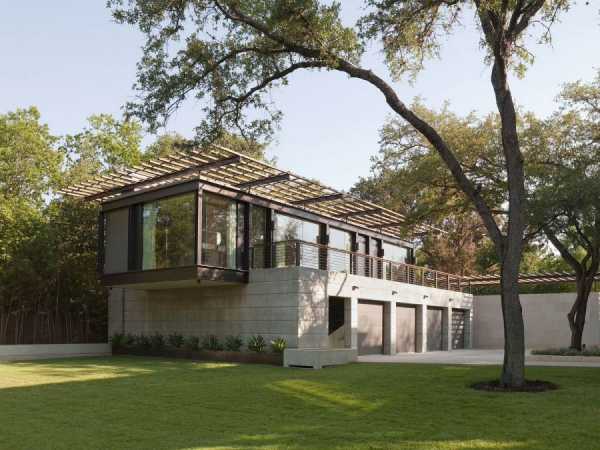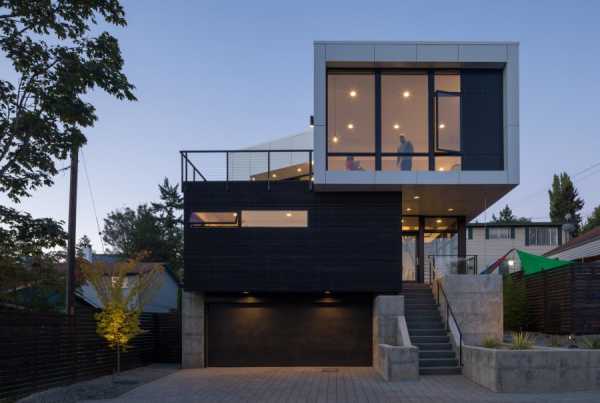 Гараж, встроенный в дом, выдержан в едином стилистическом ключе