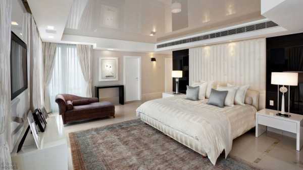 Оформление потолка можно выполнить в зеркальном виде. Такой способ немного украдет высоту спальни, однако натяжные глянцевые потолки практичны в эксплуатации, долговечны и дополнительно визуально увеличивают объем комнаты.