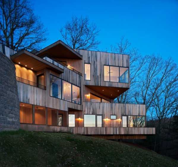 Такой дом органично впишется в окружающую природу. Будет теплым и надежным жилищем, которое прослужит многие десятилетия без капитального ремонта. Лучше всего строить из цельного массива дерева. Если использовать современное оцилиндрованное бревно, то не понадобится никакая дополнительная отделка, как изнутри, так и с внешней стороны. Фасад лучше пропитать специальным составом, который увеличит срок службы дерева.