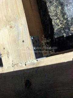 Затем также пропениваем стыки досок , которые мы использовали для создания обвязки второго этажа и делаем гидроизоляцию основания чернового пола используя листы рубероида. Затем прикручиваем листы фанеры, чтобы можно было работать по монтажу каркаса стен второго этажа. Совет: Мы сделали большую ошибку в настилу фанеры. Поняли мы это только после того как начали эксплуатацию помещений. Пол заскрипел в местах стыков. Фанеру лучше укладывать в шахматном порядке, чтобы листы образовывали не четырехгранный угол, а только угол на три стороны (Т — образный угол) | |