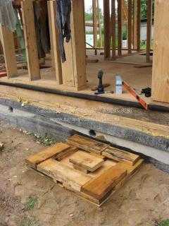 Дайте фундаменту еще неделю времени, чтобы окончательно выстоялся, а после этого срока приступаем к монтажу основания каркаса пола первого этажа. По верхней стороне фундамента расстилайте рубероид который предварительно использовали в опалубке. Поверх него укладываем обрезные две доски сечение 150*25 мм и крепим их на анкерные болты к фундаменту. Это будет основание каркаса пола первого этажа. Затем к ним скручиваем короб из досок поставленных на торец. Доски те же, что и в основании каркаса. | |