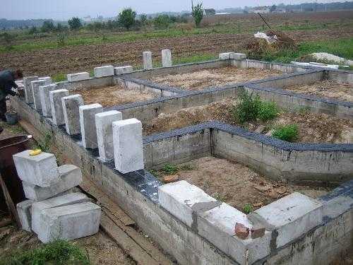 - фундамент на бетонных столбах — когда грунтовые воды расположены близко к поверхности земли или нет смысла строить сплошную основу;