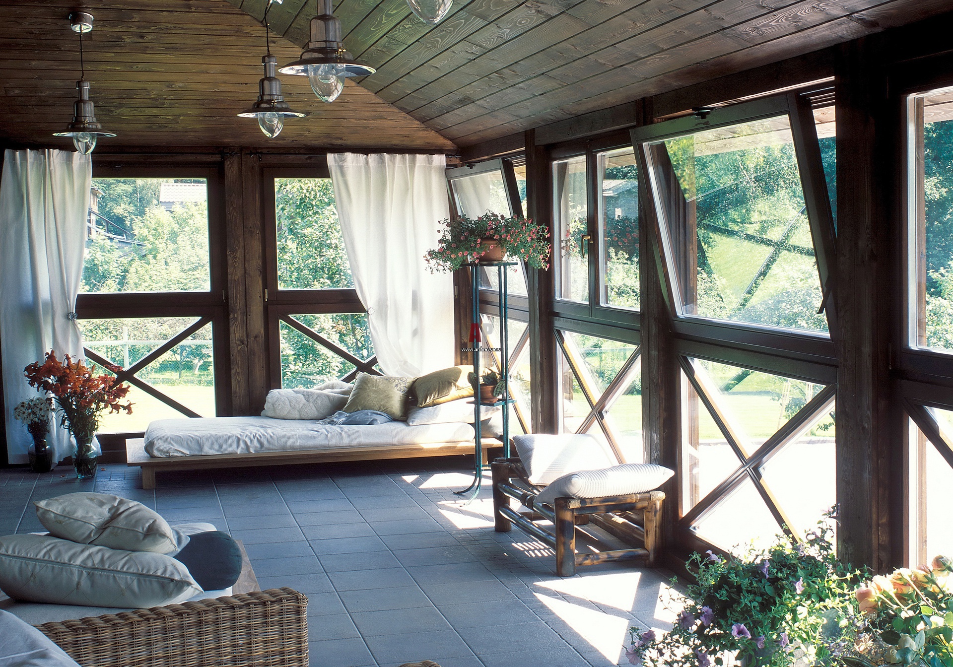 Большинство стен веранды имеют окна; Поэтому такую большую мебель, как шкафы, полки, стеллажи ставят у глухой стены.Обычно можно разместить стол, стулья и диваны по центру или вплотную к окну. Для экономии места можно использовать откидной столик, прикрепленный к подоконнику. Поскольку веранда — очень солнечное помещение, на окна стоит повесить шторы, жалюзи или занавески из соломы.