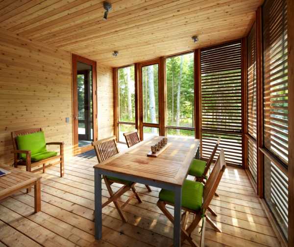 Для защиты от солнца на террасе навес выполнен из деревянных планокЗастеклённая веранда