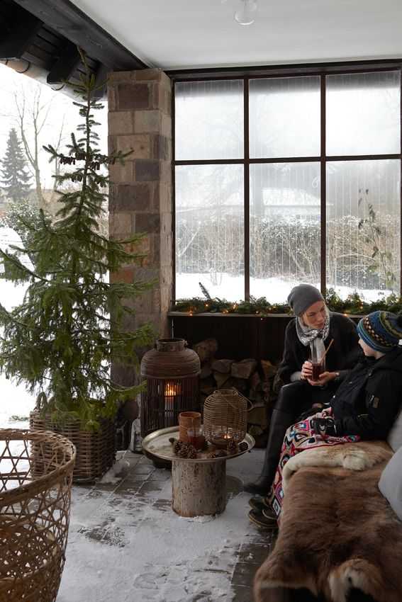 Не думайте, что открытая веранда актуальна только в теплую пору. Добавьте пару пледов, шкур и камин — вот и готов зимний интерьер веранды в частном доме и место для посиделок.