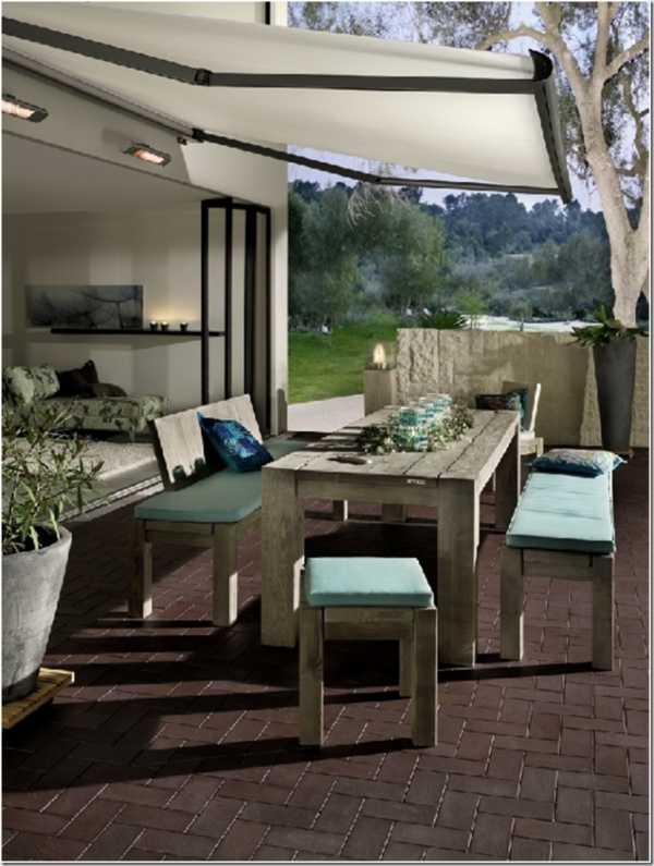 - Навес и ограждающие конструкции защитят от ветра, жары и осадков, но желательно, чтобы они обладали небольшим весом. Для этих целей можно использовать рамное (алюминиевое) остекление, стационарные навесы, изготовленные из влагостойкой ткани или раздвижные системы на дистанционном управлении, которые при необходимости расправляются над площадкой.