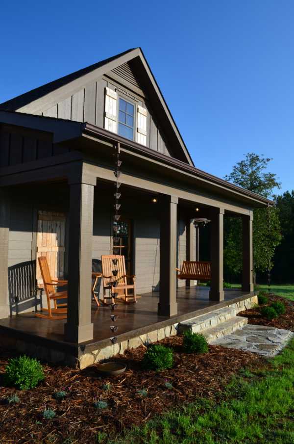 Самый простой вариант – открытая веранда, которая имеет с домом общую стену и навес (крышу), такое себе очень большое крыльцо. Получается открытое пространство с максимумом удобств (стулья, кресла, лежанки-кровати, как вариант — гамак), к тому же закрытое от солнца и дождя. А вьющиеся растения, заплетающие веранду, добавят уюта и приятной интимности.