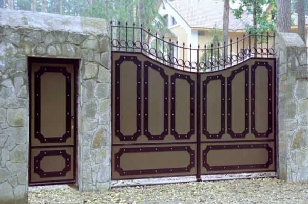 В последнее время самыми распространенными вариантами стали металлические конструкции. Для более дешевого обустройства можно использовать обычный профнастил, а для более богатого и роскошного – сочетание сплошного металла с элементами ковки. Однако и ворота из древесины тоже смотрятся довольно неплохо.