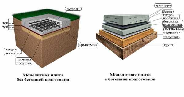 На выровненную площадку укладывается гидроизолирующий материал и армирующий каркас, после чего заливается монолитная плита. К минусам такого фундамента нужно отнести большую дороговизну и затраты по используемым материалам для строительства.