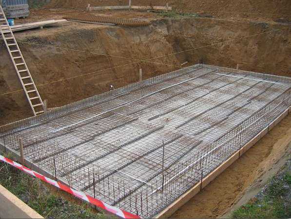 В специально устроенную опалубку монтируют арматурный каркас. И заполняют полученный объем товарным бетоном. Для улучшения свойств фундамента и равномерного распределения смеси дополнительно утрамбовывают вибраторами.
