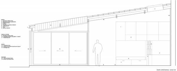 Разрез. Здесь видно, что благодаря скошенной кровле высота дома-гаража постепенно увеличивается от улицы к заднему торцу постройки, это позволило вписать туда «двухэтажный» мебельный блок.