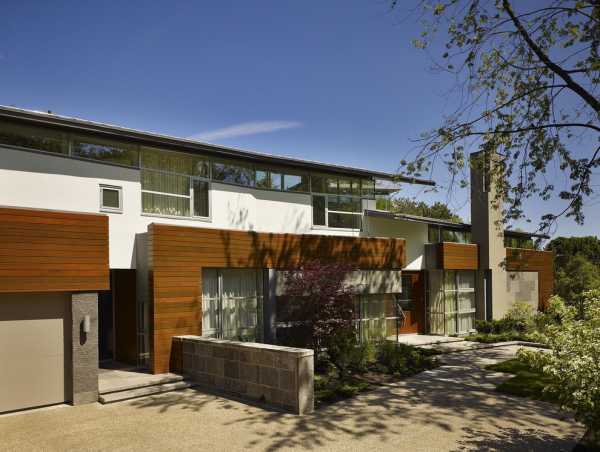 Здесь использован аналогичный подход. Однородные деревянные планки украшают здание от правого края к левому, где расположен гараж.