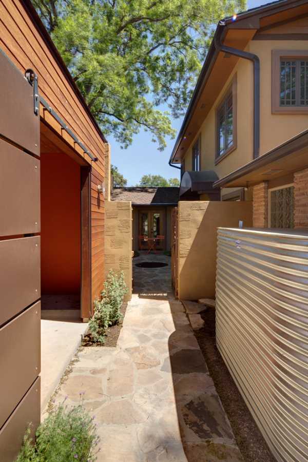 Причудливая дорожка соединяет жилой корпус с гаражным помещением, вход в которое находится за скользящей раздвижной дверью.