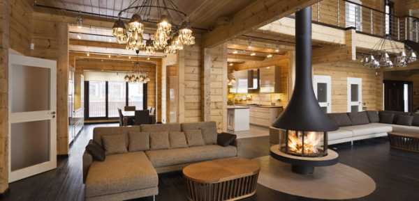 Размещение камина в средней части помещения также имеет свои преимущества. В данном случае проще выполнить установку дымоходов. В качестве минуса подобного размещения следует отметить сложность их чистки.