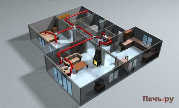 Поэтому при выборе печи или камина продумайте их размещение. Возможно, придется приобретать потолочный вентилятор или другие приборы. Если камин размещен на первом этаже, а отапливать планируется также второй этаж, нужно посмотреть, как туда будет подаваться теплый воздух. Первый вариант — свободная циркуляция. Но тогда обогрев будет неравномерным: в дальних помещениях холоднее и они дольше прогреваются. А если помещения изолированные (закрыта дверь) — они не будут прогреваться совсем, либо прогрев будет очень долгий. Второй вариант — развести рукава с теплым воздухом, когда от отопительного прибора теплый воздух идет по воздуховоду и через вентрешетку поступает в комнату. Здесь нужно учесть на какую длину необходимо тянуть рукава — при большой длине может понадобиться специальный вентилятор.