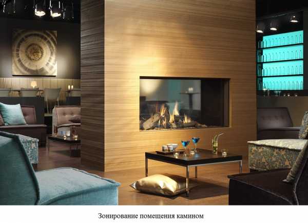Весьма широкие возможности для дизайнерского творчества предоставляет вариант, когда камин размещается в торце стены. Неплохим решением с этой точки зрения является использование камина в качестве элемента, разделяющего пространство помещения на несколько функциональных зон.
