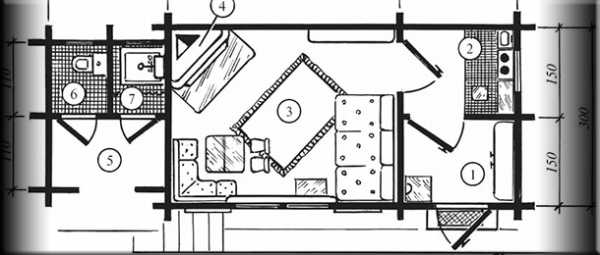 План домика с камином: 1 – прихожая; 2 – кухня; 3 – гостиная; 4 – угловой камин; 5 – пристройка; 6 – туалет; 7 – душ