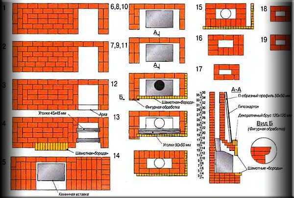 Чугунная топка по фасаду имеет отбортовку. Боковые стенки из кирпича укладываются по уровню отбортовки, оставляя до стенок топки некоторый зазор. Плотное прилегание облицовки к несущей стене обеспечивается гипсовой штукатуркой.