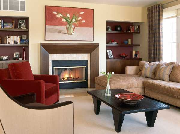 Если вы хотите сэкономить пространство, то вместо массивных кресел, можно использовать компактные банкетки. По желанию, в гостиной с камином, можно поставить небольшую кушетку либо аккуратный диван.