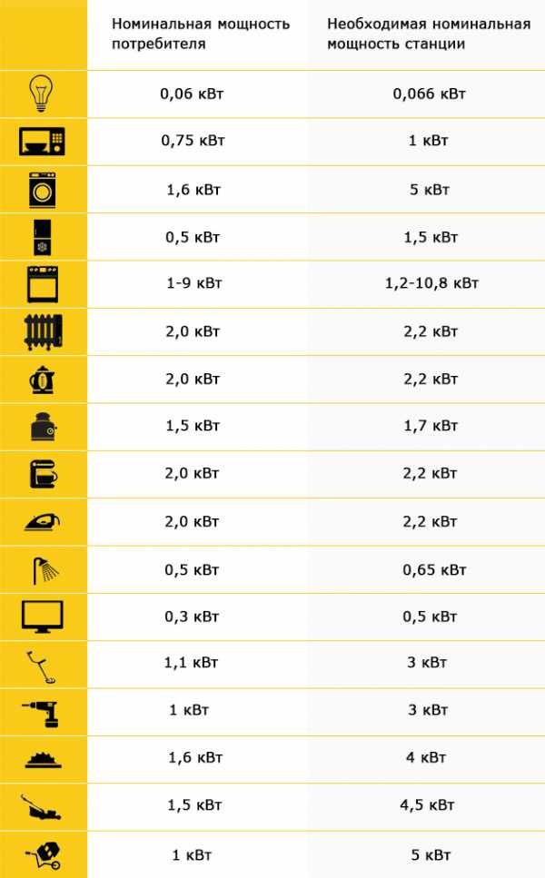 Мощность всех вышеперечисленных электроприборов составляет в сумме около 1,5-2 кВт. Чтобы определить тип нагрузки, которая приходится на наш источник питания, рассмотрим таблицу пусковых токов и рассчитаем необходимую мощность для всех потребителей энергии, подключенных к сети одновременно (возьмем максимальные значения): 0,3кВт×3,3+0,2кВт(две 100Вт лампы)×1+0,08кВт×1+0,8кВт×1,2=»2,23кВт. Поскольку максимальная мощность электрогенератора, то есть мощность, которую агрегат может вырабатывать за небольшой промежуток времени, как правило, превышает его заявленную мощность, нам подойдет генератор с номинальной мощностью 2″ кВт.
