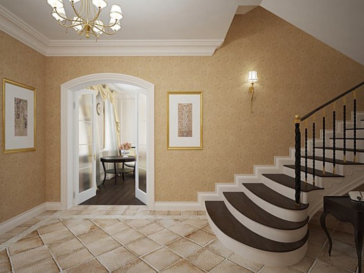 Для отделки холла в частном доме в классическом стиле используют жидкие обои, прованс – бумажные с растительным орнаментом бежевого либо белого цвета. Для минимализма актуальны также коричневый, черный и серый.
