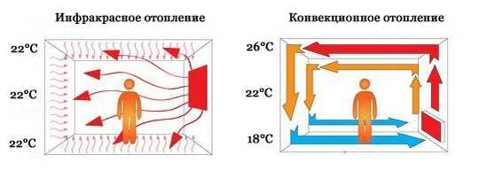Классические отопительные приборы греют за счет нагрева воздушных масс – те поднимаются вверх, вытесняя более холодный воздух вниз. Подступая к настенным или напольным обогревателям, они нагреваются и снова уходят вверх. Так образуется непрерывный круговорот, постепенно прогревающий комнаты и помещения. Аналогичным образом греют и электрические обогреватели (те же конвекторы), затрачивая на это гигантское количество энергии.