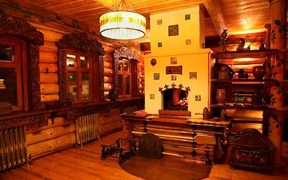А ещё хорошо бы поставить в центре помещения традиционную русскую печку. Полюбившийся уже камин ну никак в родном нам интерьере смотреться не будет.