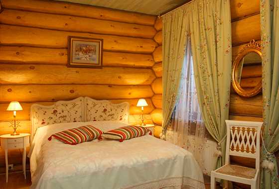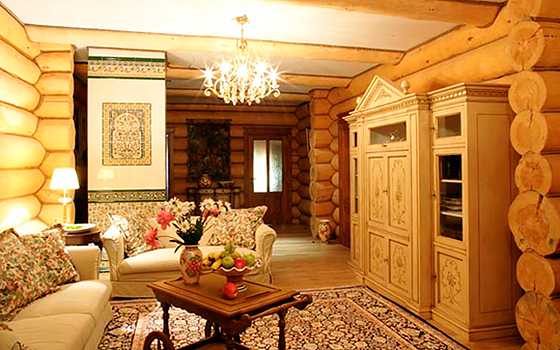 Но это мнение специалистов. А хозяева домов из дерева часто предпочитают традиционные варианты, и прежде всего стиль «русской избы». А это минимальная обработка деталей из дерева и преобладание ярких цветов в убранстве: роспись на стенах и потолке, пестрые дорожки и лоскутные одеяла, белые вязаные салфетки и скатерти, обилие декоративных предметов национального быта – самоваров, прялок, деревянных сундуков.