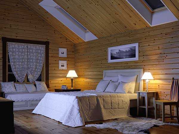 Еще одна проблема: отражательная способность дерева не самая высокая. Если дерево ничем не обработано, то его шероховатость, мельчайшие неровности дают тени и такие потолки «нависают». Даже обработанные бесцветным лаком потолки будут отражать меньше света, чем обычные белые. Освещение комнат, при одинаковом количестве источников света, в деревянном доме с «натуральными» поверхностями будем более тусклым, чем в доме с обычными белыми потолками.