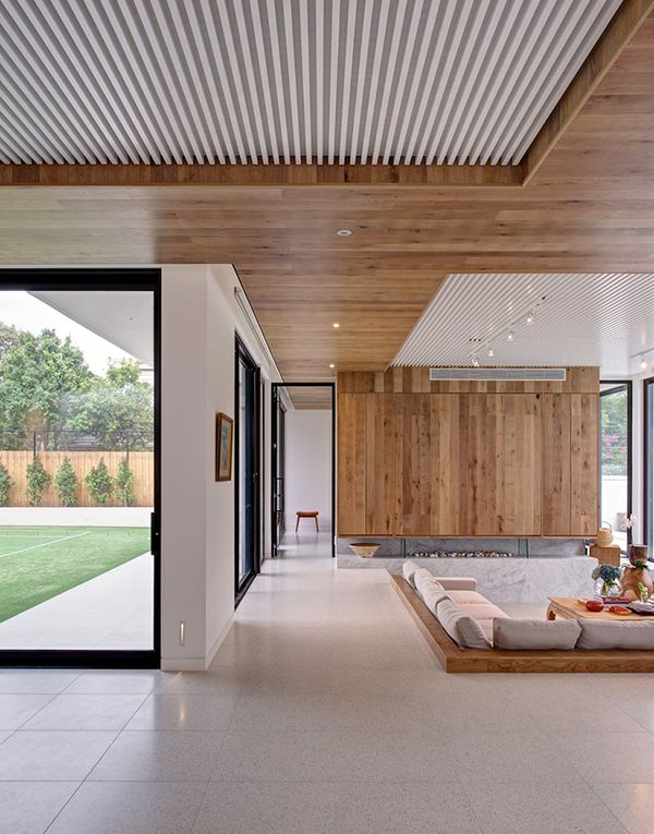 Потолки часто не украшают, но они играют важную роль в хорошо спроектированном помещении. Следуйте примеру этой комнаты и посмотрите вверх, добавив дерево к потолку, также известному как пятая стена. Белые стены позволяют деревянному потолку и отделке выделяться, создавая сильное архитектурное присутствие.