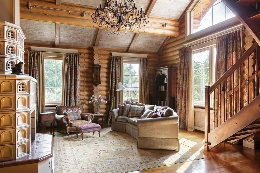 Когда основным к проекту дома из бревен ручной рубки является пожелание, чтобы ничто не напоминало городское жилье, стиль дизайна интерьеров балансирует на грани традиционного и современного.