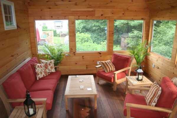 Ровно подшитый потолок веранды может скрадывать большую часть помещения. Для того чтобы деревянная веранда стала просторной, потолок должен повторять форму внутреннего свода крыши.