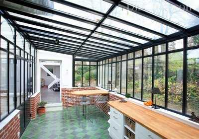 Веранды с прозрачной крышей буквально утопают в ярких потоках солнечного света. Через своды куполообразной стеклянной крыши в течение всего дня будут проникать солнечные лучи, оживляя помещение своим свечением. Ваша задача лишь усилить эффект, оформив помещение меблировкой в светлых оттенках и создав легкую обстановку зоны отдыха при минимальных затратах.