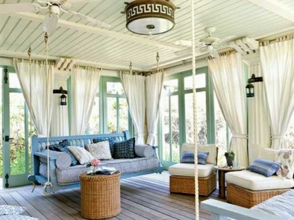 При оформлении веранды в средиземноморском или скандинавском стиле как нельзя лучше подойдут занавески из легких и полупрозрачных тканей. Сочетание светлых оттенков создает праздничную атмосферу изобилия света.
