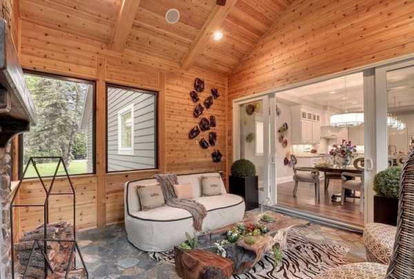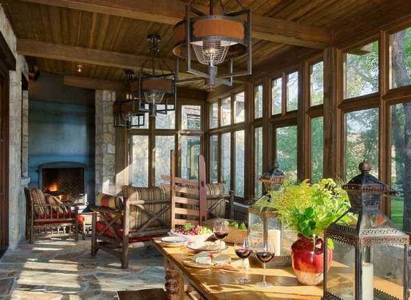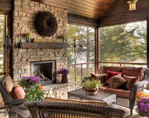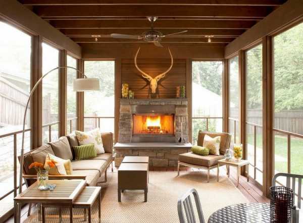Основным преимуществом декоративных элементов из природных материалов, является то, что они легко сочетаются между собой. В интерьер деревянной веранды отлично впишется камин, с отделкой из натурального камня. Помимо своей основной функции, камин делает интерьер веранды колоритным.