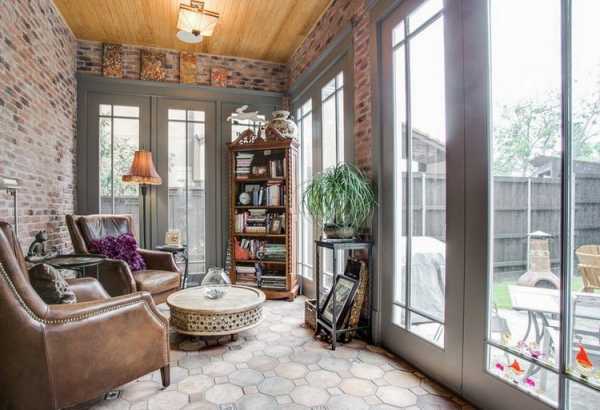 Чаще всего в качестве отделочных материалов для напольного покрытия веранд применяют керамогранитные или каменные плиты. Этот способ облицовки не только привлекателен, но и практичен. Влагостойкие материалы в неотапливаемом помещении не отсыреют в холодное время. Да и уборка поверхности от следов после питомцев или грязной обуви отнимает минимум сил и времени.