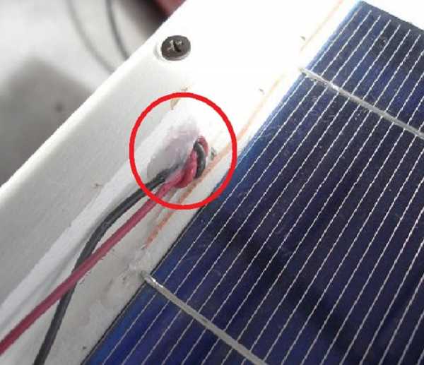 - Зафиксируйте выводы солнечной батареи в отверстиях при помощи герметика и поместите в рамку.