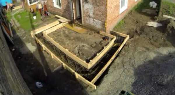 - «Лента-лента» — откапывается часть фундамента дома длиной 1,5–2 м, укладывается песчаная подушка, на глубине ¾ основания вбивается арматура 12–14 мм, формируется каркас пристройки;