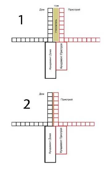 Деформационный шов более надёжен, снижает риск разрушительного действия осадки. Пристройка возводится на отдельном фундаменте рядом с домом. При этом лучше использовать замкнутый контур основания. Между основаниями и по периметру нового фундамента укладываются листы рубероида. При использовании этого варианта осадка пристройки не повредит фундамент дома.