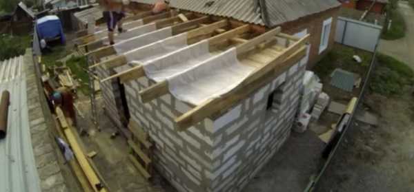 Завершающим этапом строительства является постройка крыши. Обычно пристройка к дому из пеноблоков имеет не очень большую площадь, поэтому устраивается наиболее простой вариант крыши — односкатный с уклоном от основного дома. Это особенно важно, когда делается пристройка из пеноблоков к деревянному дому. Если не обеспечить сток воды в нужную сторону, дерево начнет мокнуть и гнить. Собственно, пристройка из пеноблоков к кирпичному дому требует отвода дождевой или талой воды в такой же степени. Влага, впитывающаяся в материал стен, в зимнее время начинает замерзать и расширяться, что разрывает материал и способствует его быстрому разрушению.