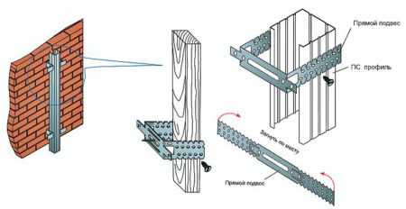 Для крепления металлических профилей используются подвесы, в виде тонких оцинкованных листов. Они имеют П-образную форму, и к поверхности стены крепёж производится саморезами. С противоположных концов поверхности начинается крепление двух полотен, которые выполняют функцию направляющих.
