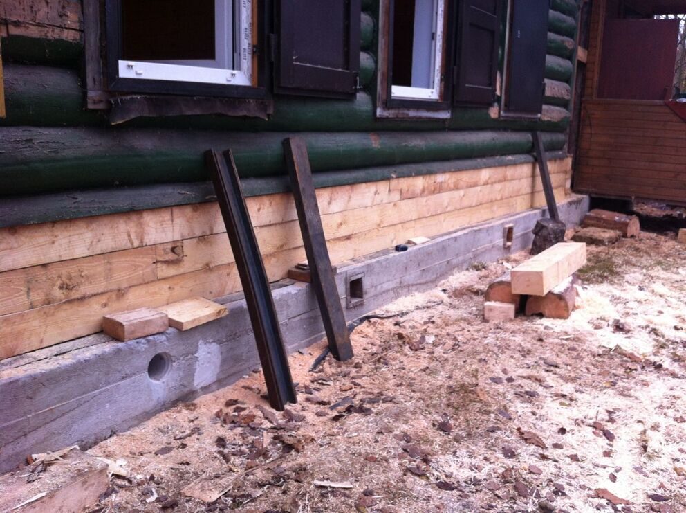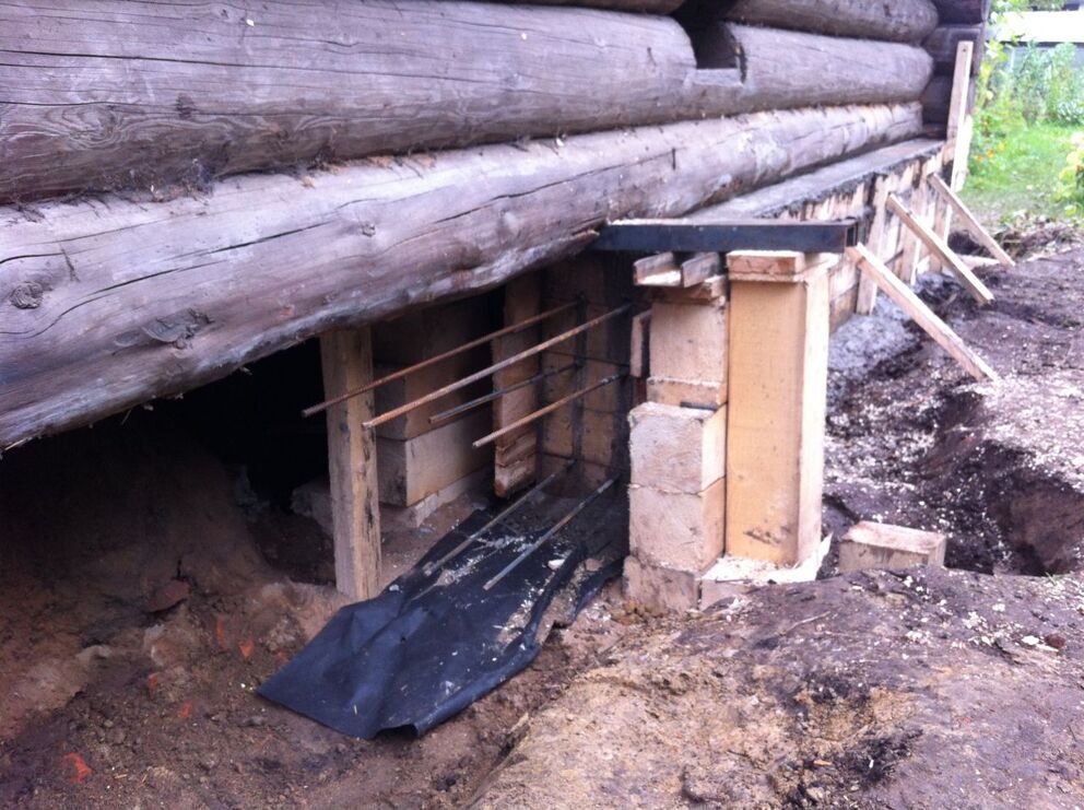 - Поверхность фундамента подводится под неповрежденные бревна.
