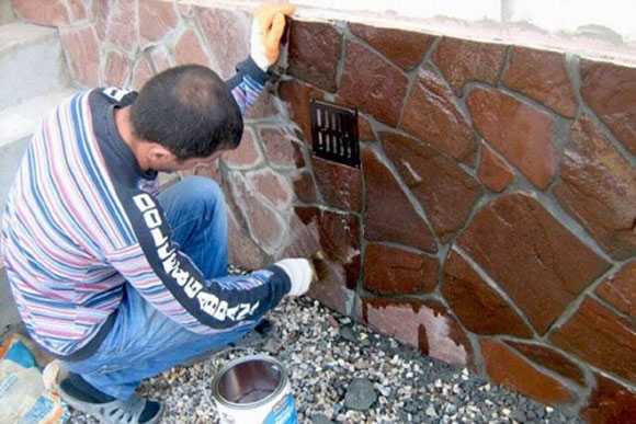 Определенные виды материалов для отделки фундамента, необходимо поддавать дополнительной обработке перед началом их укладки. К ним относится ненатуральный камень, на который перед закреплением наносят средства отталкивающие воду.